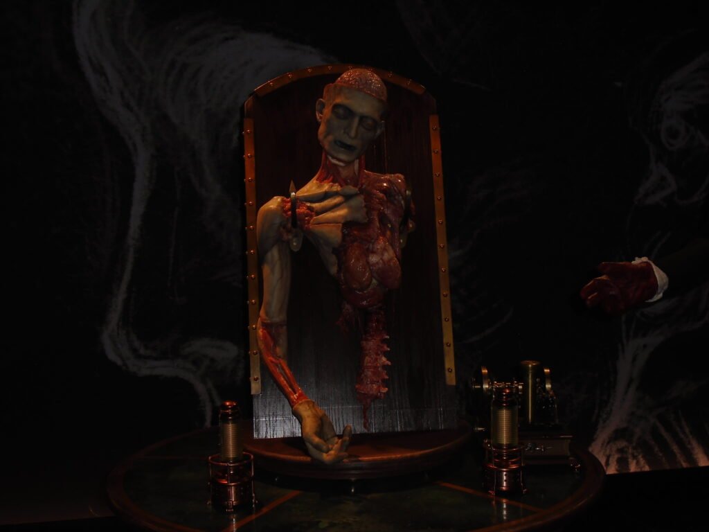 No phones. No cameras. Just the screen. Spoilers are protected here by design. You don’t walk out with images — you walk out with atmosphere. Nearby, laid out like specimens in a dream lab, are full-scale anatomical sculptures of Frankenstein’s monster: torsos opened, faces mid-transformation, skin half-built. Del Toro’s take isn’t theatrical — it’s intimate, physical. You feel the craftsmanship in every line.