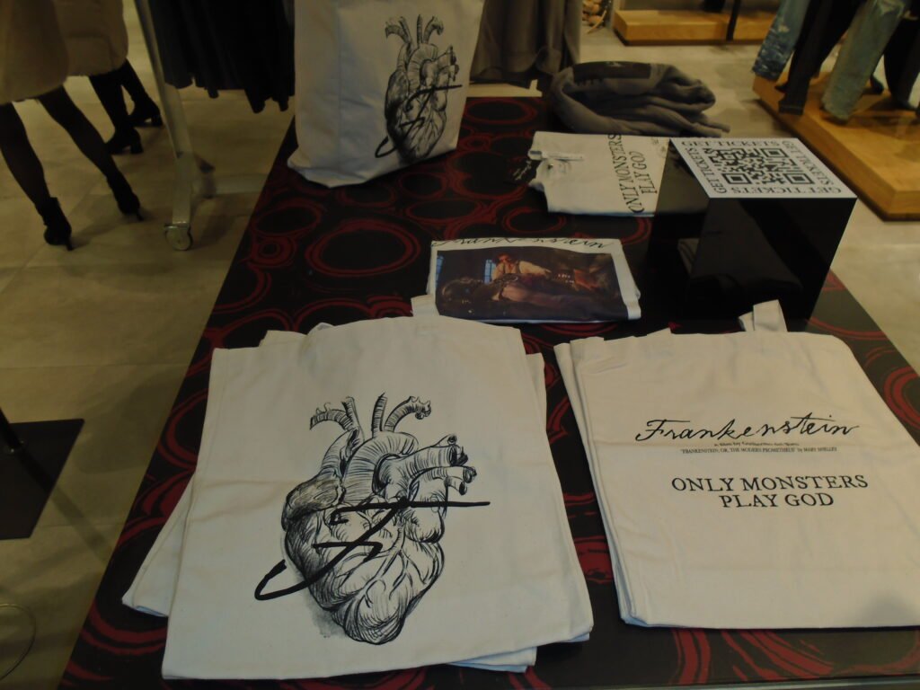 You enter through the shadow. Candlelit walls. Scribbled anatomy. Stained textures. It’s quiet, theatrical, and strangely intimate — like being invited into the process of a dream. Each corridor opens into fragments of the film’s design: hand-illustrated storyboards, sculpted prosthetics, annotated script pages, and curated relics that stretch beyond the movie, including first-edition volumes of Mary Shelley’s original novel.